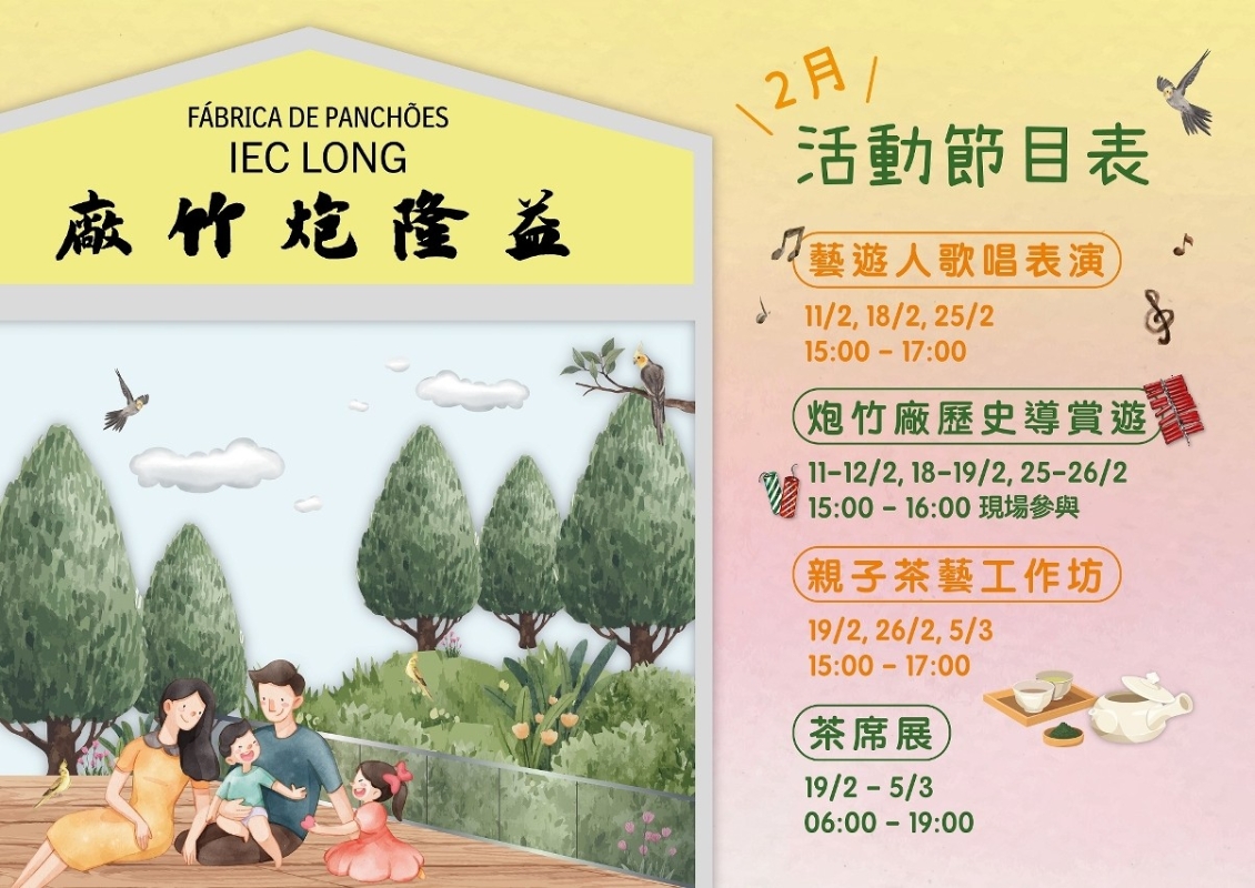 香港新聞網2月9日電 澳門特區政府文化局將於2月期間逢周末在益隆炮竹廠舊址舉辦多項特色活動,包括藝遊人音樂表演、親子茶藝工作坊及炮竹廠歷史導賞遊等,持續豐富園區的體驗元素,讓市民旅客在綠意環抱的炮竹廠舊址,共度藝文相伴的悠然時光。