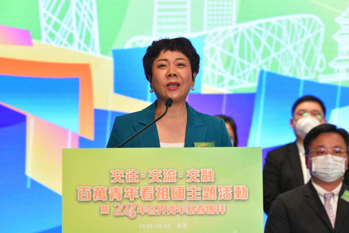 中華全國青年聯合會秘書長劉愛平致辭 劉愛平在致辭中介紹“百萬青年看祖國”主題活動。她表示,這三年裡,我們親歷了香港由亂到治到由治及興的關鍵轉折,習近平主席在回歸25周年之際視察香港,香港國安法和完善選舉制度一錘定音,新一屆特區政府展現出愛國、創新、敬業的嶄新氣象,《青年發展藍圖》繪就了香港青年的美好明天。隨著內地與香港往來恢復,兩地青年迎來了大交流大融合的契機。劉愛平秘書長用三句俗語與大家共勉,分別是“願展黃鶴翅,一借飛雲空”、“拋棄區分求共對”、 “屋企人掛住你啊”。 她期望香港青少年多來內地,全國青聯及內地各級青聯組織已做好準備,給大家帶來一段終身難忘的旅程。