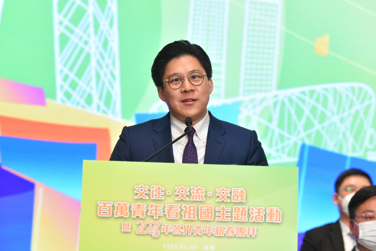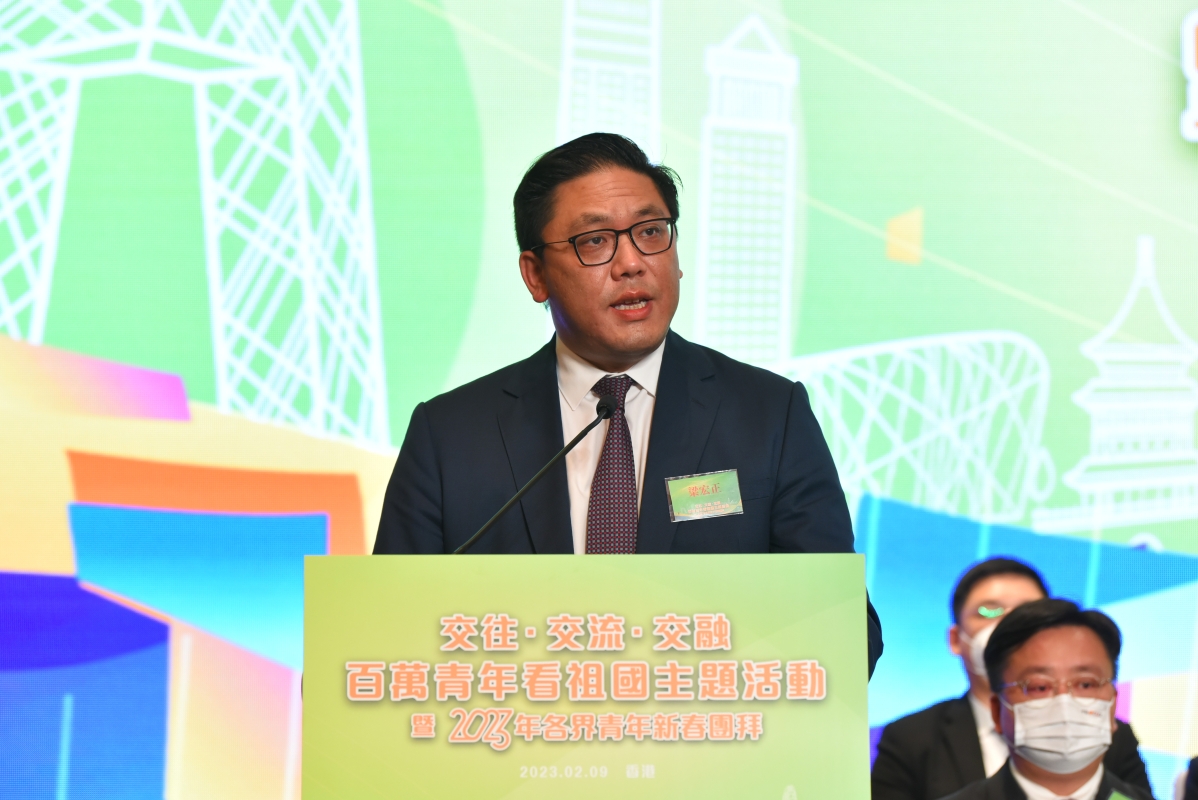 中華全國青年聯合會副主席、香港特別行政區民政及青年事務局副局長梁宏正致辭 梁宏正介紹特區政府剛發佈的《青年發展藍圖》的各項工作。他表示,政府首次為青年發展而製定的青年發展藍圖,定制青年未來發展工作,制定六大方針,超過一百六十項青年工作及措施,政府會積極蒐集各界的反饋,確保藍圖與時並進,貫徹持續推動青年發展的政策,培養更多愛國愛港的青年。