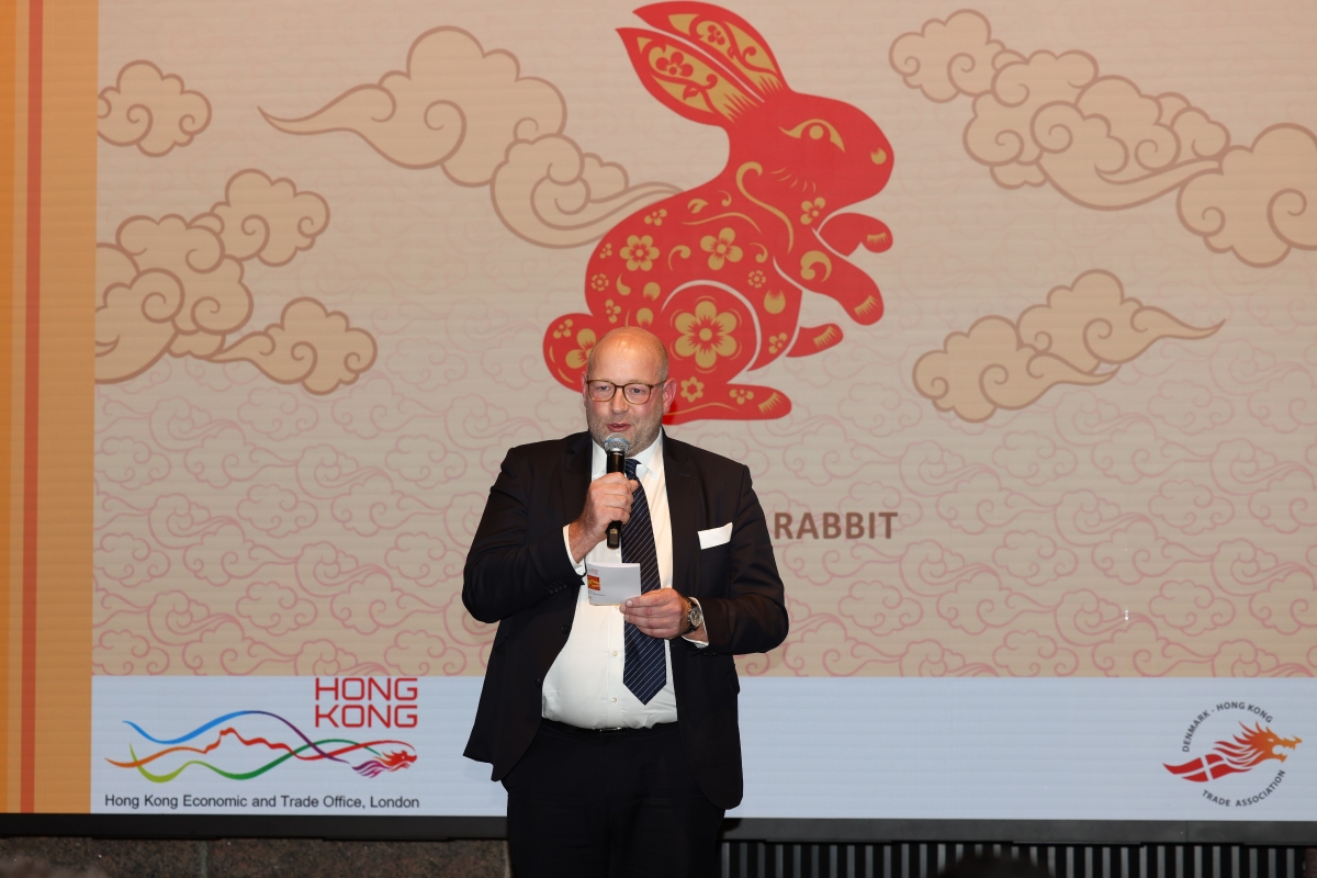 圖示丹麥—香港貿易協會主席Nikolaj Juhl Hansen 在哥本哈根酒會致辭。