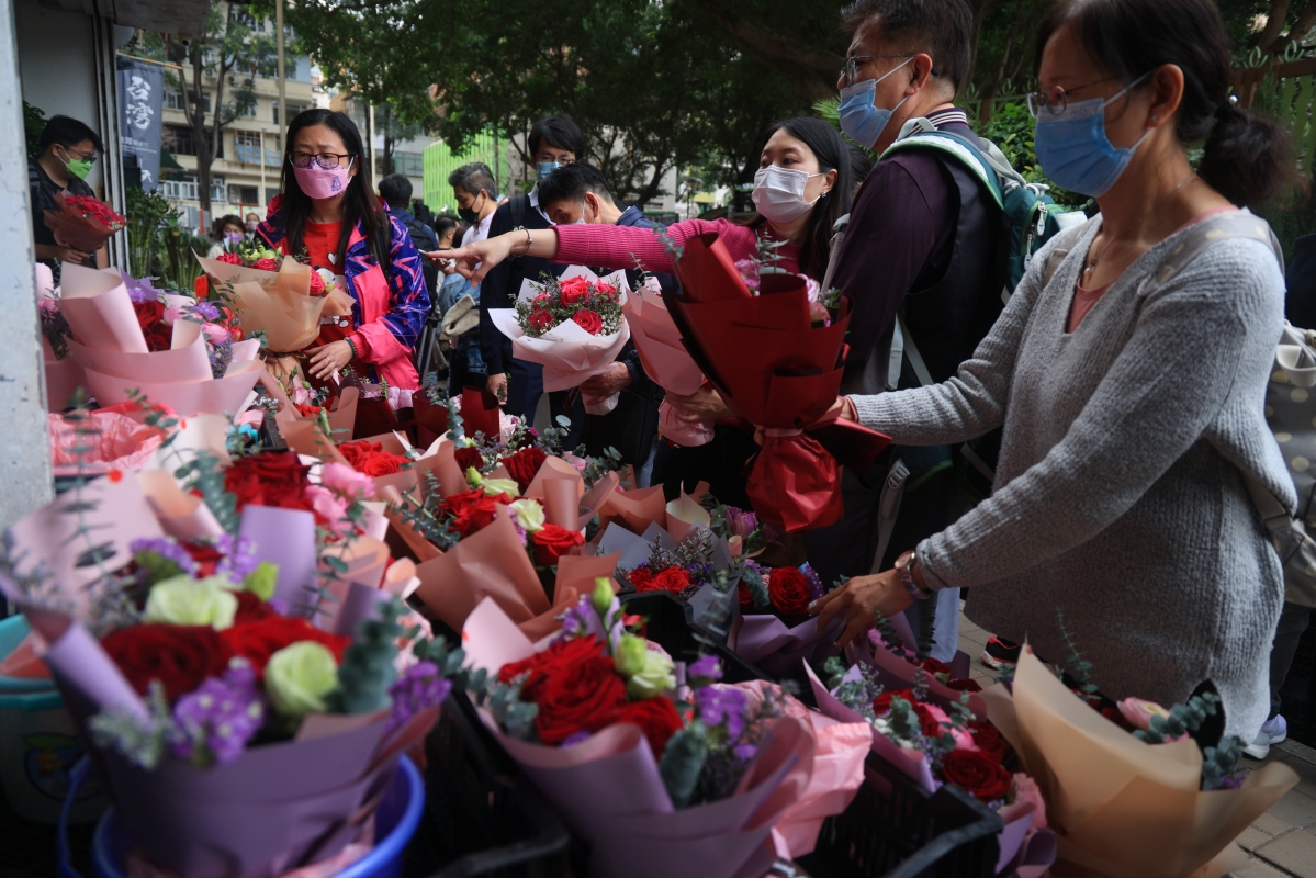 香港新聞網2月14日電(記者 許其皓)2月14日,是香港與內地全面“通關”後首個西方情人節,隨著香港逐步復常,今年情人節氣氛比往年來得濃烈。 2023年恰逢雙春兼閏月,傳統上是婚嫁好時年,更有機會明年生“龍寶寶”。今年亦是香港三年疫情以來,大部社交距離措施放寬下的首個情人節。這一日亦是“宜嫁娶”,香港共有248對准新人結婚,較去年增一倍,業界料婚嫁市場生意增三成。 香港最大花市旺角花墟街,發現不少花店擺出各式各樣扎好的情人節鮮花吸引顧客。99支玫瑰平均價格為四、五千港元;10支玫瑰價格為500至700港元。上午整體人流不多,至中午開始人流密集,不少男士趁著工作日午休時間來給伴侶買花。