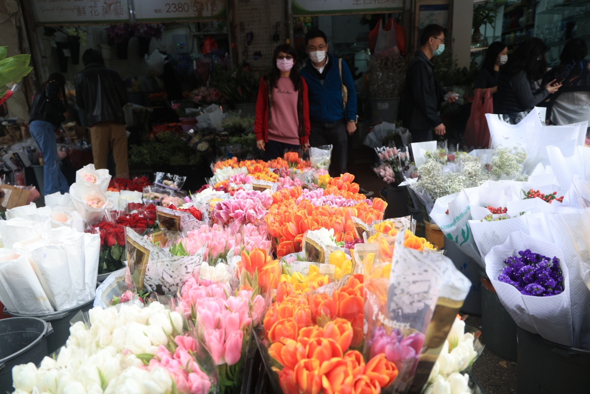記者當日到訪香港最大花市旺角花墟街,發現不少花店擺出各式各樣扎好的情人節鮮花吸引顧客,花店內外擠滿了前來買花的顧客,有商家表示,預計今年情人節整體生意較去年增兩至三成。