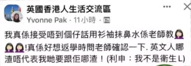 臉書截圖 豈料,這則吐槽英國衛生教育的帖文一出,竟引來不少移英的香港家長共鳴。 在該帖文下方,有家長對帖主所說的情況“並不意外”,甚至覺得“能教(孩子流鼻涕)要抹已算好”,又大吐苦水稱,有英國老師教自己的女兒“去完小便不用洗手,去完大便才要洗手”。