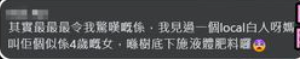 香港家長評論 有網友分享了最令其“震驚”的見聞,稱曾遇過一個當地的白人媽媽,叫其大約4歲的女兒在樹底下施“液體肥料”。 有網友表示,正是在這樣過於“污糟”的環境中,自己的孩子不久前眼睛過敏了一周,現在嘴邊又過敏了。