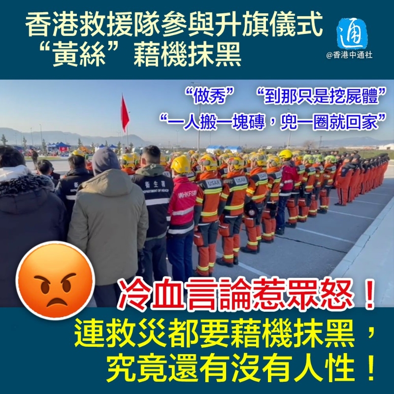 香港新聞網2月16日電 香港特區救援隊日前趕赴土耳其協助救災,這樣一個守望相助的時刻,竟有“黃絲”在一旁說風涼話,稱救援是“作秀”,令人汗顏! 特區救援隊10日抵達土耳其地震災區,與國家救援隊會合後,完成營地駐紮,並參與升旗儀式。