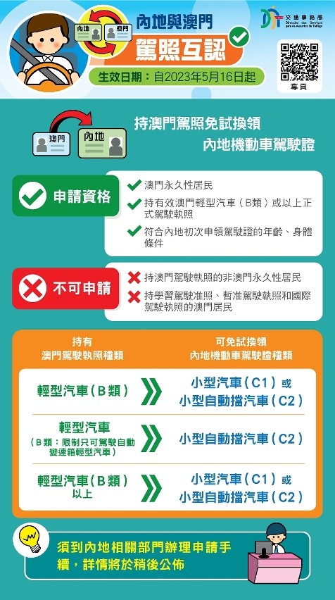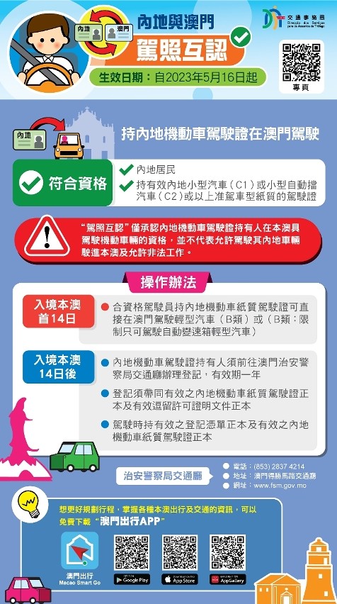 圖源:澳門新聞局 據公佈,對持有效正式澳門駕駛執照的澳門永久性居民,持正式澳門駕駛執照,以及身份證明原件、身體條件證明、照片,可以直接免試換領內地駕駛證,無需參加考試;持有效內地紙質駕駛證人員,在入境澳門14日內可直接駕駛規定車型,無需換領澳門駕駛執照;入境超過14日需繼續駕車的,經澳門治安警察局交通廳登記後一年內可以在澳門直接駕駛規定車型。 交通事務局表示,內地與澳門駕駛證互認換領,將直接惠及內地與澳門旅遊、探親等人員,更加便利內地和澳門居民駕車出行,更好促進內地與澳門交流發展。 公安部有關負責人介紹,此前,內地與香港已經實現了駕駛證互認換領。內地與澳門駕駛證互認換領,將大大便利粵港澳大灣區居民往來,對推進粵港澳大灣區建設具有重要意義。下一步,公安部將積極指導地方公安交管部門做好內地與香港、澳門駕駛證互認換領工作,進一步便利內地與港澳居民駕車出行。(完) 【編輯:崔靜雯】