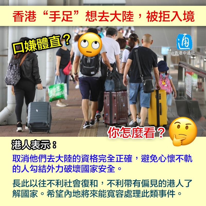 香港內地全面通關,不少港人於春節期間返鄉(香港中通社) T同學(化名)早前因非法集結被判囚16個星期,已完成服刑的他年初入境亦被拒,他稱是“意料之內”。 T的父母居於內地,他預期未來幾年也難再申請回鄉證,更可能一輩子沒法踏足內地。不過他對過往行為並無悔意,聲稱這是參加所謂“社運”的代價,“早有心理預備”。 “不是不喜歡大陸嗎?為什麼還去?”對於部分港人過往參與“黑暴”,如今又北上前往大陸的行為,有網友揶揄,“手足”口說“反中”,原來心繫祖國,果然“身體最誠實”! 有網友嘲諷稱,“其實不讓入境都不是最有效的方法,不讓淘寶就真的要命啦!” “取消他們去大陸的資格完全正確。”有網友贊同稱,不讓這些有前科的人入境內地,可以避免心懷不軌的人勾結外力破壞國家安全。 不過也有人持不同看法,認為長此以往不利於那些原本帶有偏見的港人了解國家。 立法會議員狄志遠認為,現時港府一直鼓勵和協助“修例風波”被捕者更生,盼內地將來能寬容處理此類事件。狄志遠稱,長此以往不利社會復和,也不利香港與內地融合的大方向。 全國港澳研究會顧問劉兆佳表示,現時中央仍認為香港存在“軟對抗”的國安威脅,估計短期內不會放寬政策。 【編輯:張琦】