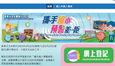 開放日採用今年世界氣象日的“天氣‧氣候‧水,代代向未來”主題,設置展覽以提高公眾對氣候變化的關注和認識,並介紹天文台如何應用嶄新科技提供各項服務,包括天氣預報、航空氣象、微氣候監測及輻射監測。 參加開放日的市民須預先作網上登記,每人最多可索取4張入場券,費用全免。如報名人數超出限額,將以電腦抽籤形式處理。登記系統由即日(2月23日)起至3月6日中午12時開放,成功獲取入場券人士會於3月14日或之前經電郵收到二維碼入場券。 (完) 【編輯:徐嘉儀】
