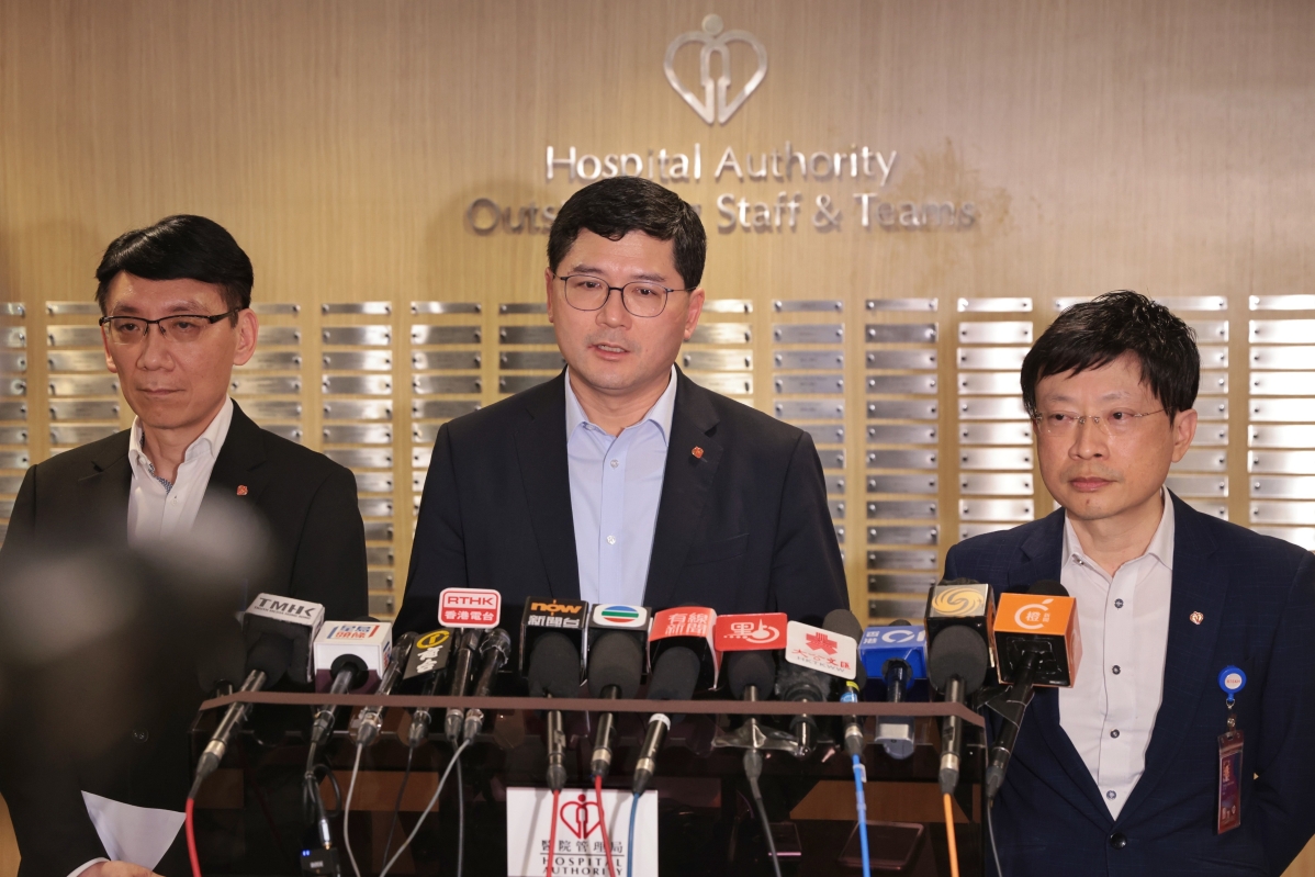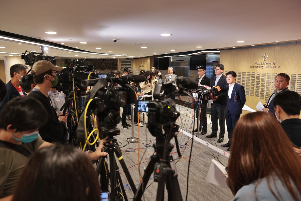 香港醫管局行政總裁高拔陞(中)會見傳媒。