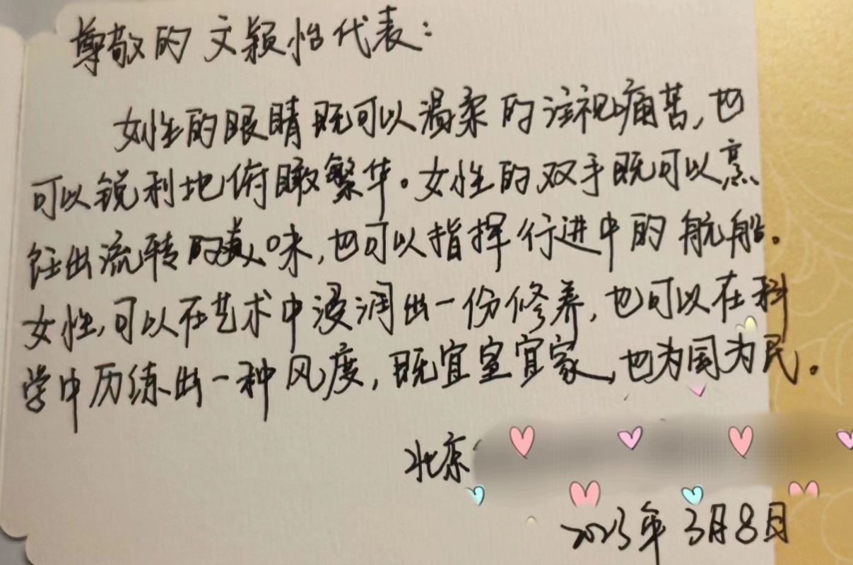 (受訪者供圖) 徐莉表示,北京飯店為女代表們慶祝國際勞動婦女節,體現了國家對於女性的尊重。“三八”婦女節是為了慶祝女性在政治、經濟和社會等領域做出的貢獻及成就,不能只是單純的演變成“購物節”。 婦女能頂半邊天!徐莉強調,背後也離不開另一半的支持和鼓勵。