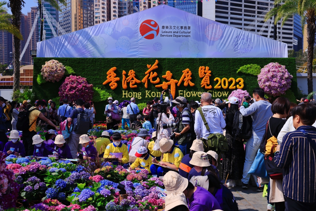 香港新聞網3月10日電(記者 曹文毓)3月10日,2023年香港花卉展覽在銅鑼灣維多利亞公園開幕。開幕上午,維園人山人海,大批市民與攝影愛好者前來。 今年花展主題為“繡麗綻放、幸福滿載”,以花形嬌美獨特的繡球花為主題花,展出約40萬株花卉,包括約四萬株繡球花,展期10天。花展的特色景點之一是鮮艷奪目的立體繡球花花牆和花圃,共有8朵由不同植物細心鑲嵌成的巨型繡球花,其中一朵直徑超過2米,展現立體美態。繡球花花圃種滿超過1200盆繡球花,為市民賞花拍照的熱點。文化體育及旅遊局局長楊潤雄在開幕典禮致辭時表示,繡球花花語有希望、美滿及團聚的意思,非常配合香港現時的情況和願景。