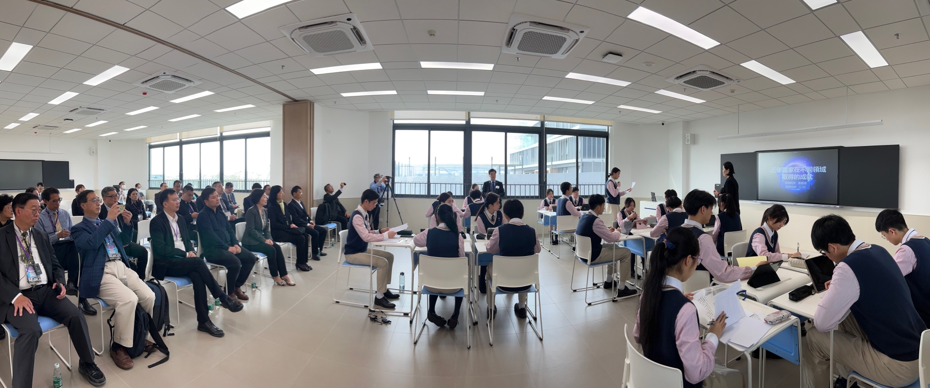 圖示蔡若蓮(左五)和教育局常任秘書長李美嫦(左六)與其他訪問團成員,在國家教育部港澳台辦副主任舒剛波(左四)及廣東省教育廳一級巡視員朱超華(左七)陪同下,參觀學生上課。