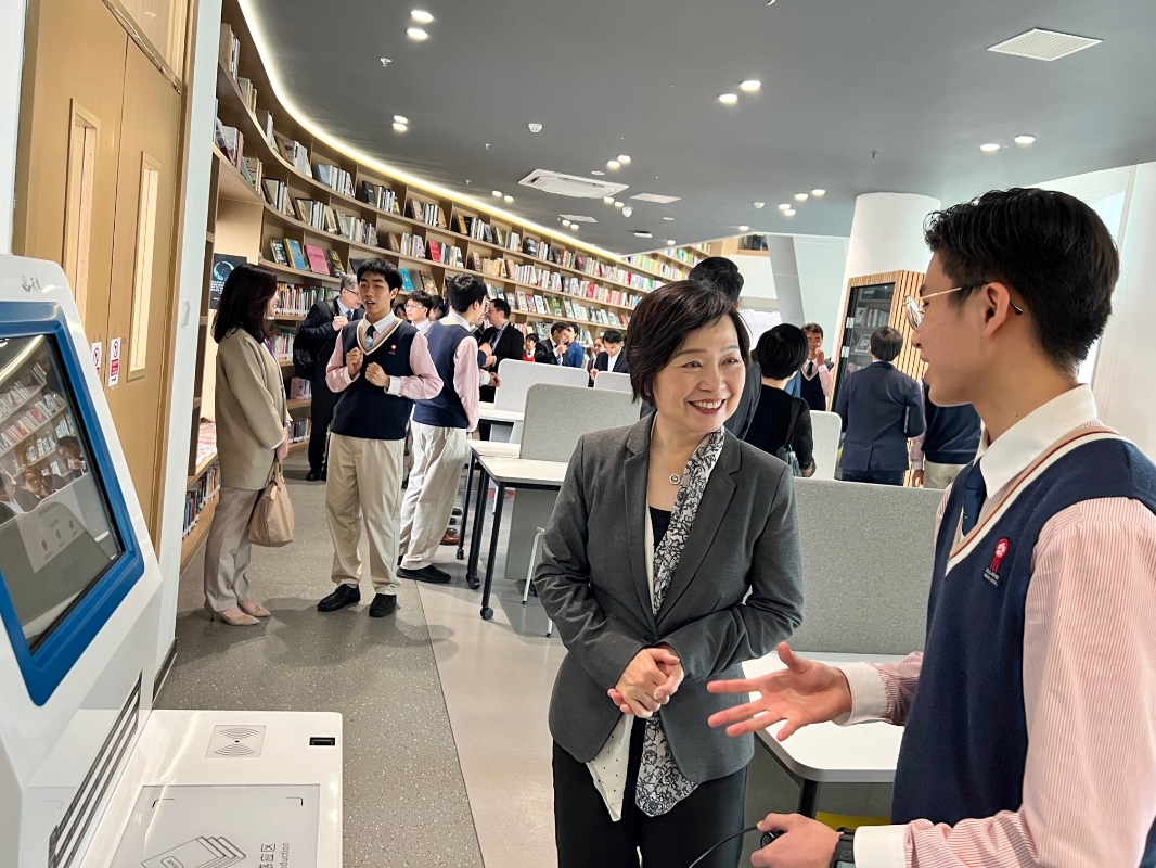 圖示蔡若蓮(左)聽取學生介紹學校圖書館設施。
