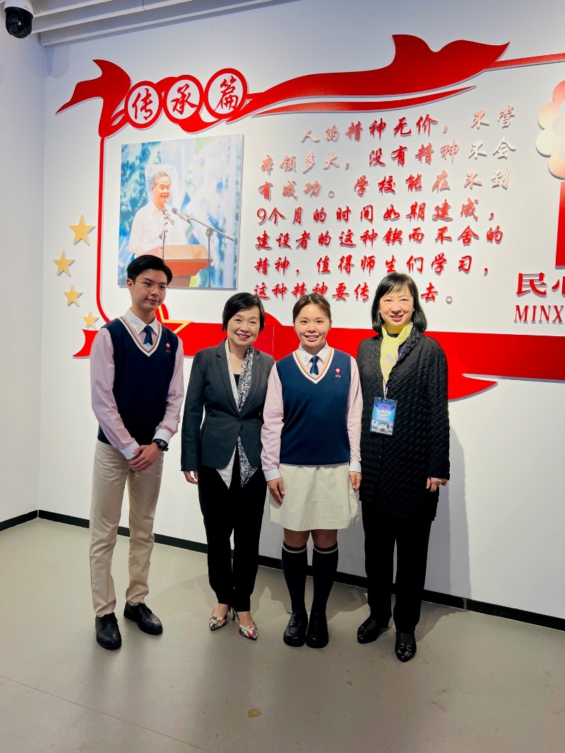 圖示蔡若蓮(左二)和教育局常任秘書長李美嫦(右一)與學生大使合照。 下午,訪問團到訪香港科技大學(廣州)與師生交流和參觀校園。他們並出席專題講座,了解南沙的發展機遇,及以香港科技大學(廣州)為例的粵港重大合作項目。