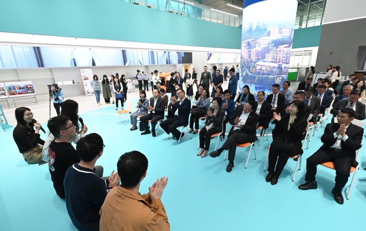 圖示蔡若蓮(右四)、教育局常任秘書長李美嫦(右二)、廣東省教育廳一級巡視員朱超華(右一)和香港科技大學(廣州)校長倪明選教授(右三)與該校學生交流。