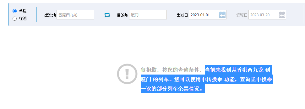 香港新聞網3月20日電 高鐵香港段的長途服務由4月1日起恢復。根據當前鐵路車票預售期15天(包括當天)的規定,有計劃在4月1日出行的旅客,應可自3月18日即可開始購票。不過,香港新聞網記者今日(3月20日)嘗試購買4月1日從香港西九龍前往廈門的車票時,發現未能購買,暫未知原因。 香港新聞網記者今日(20日)下午經12306網站查詢4月1日從香港西九龍前往廈門的車票時,發現網站顯示“當前未找到從香港西九龍到廈門的列車。”並指可以使用中轉換乘功能,查詢途中換乘一次的部分列車餘票情況。