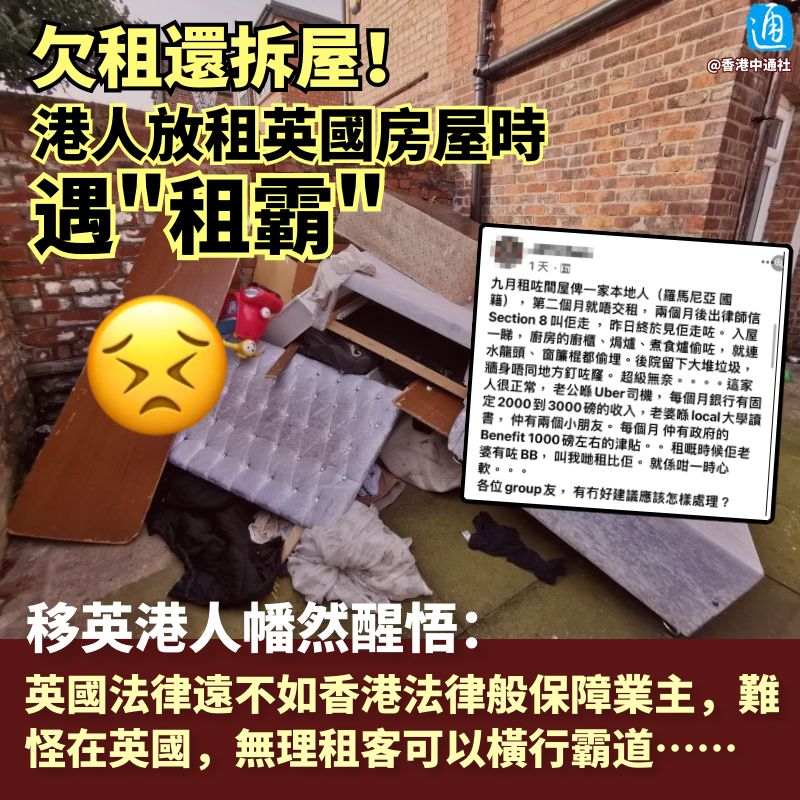 香港中通社製圖 “這家人看起來挺正常,老公做Uber司機,每個月都有2000至3000英鎊的穩定收入,老婆就在當地大學讀書。”該業主補充說,其實在租給英國租客之前,已經仔細核對過他們的收入和背景,怎料還是遇到無品“租霸”! 看到租客態度誠懇、其太太也懷著身孕,港人業主稱當初“一時心軟”便租給他們。如今對著“家徒四𤩹”,只能求助同路人,現在要如何應對處理? 貼文一發出,隨即穫不少移英港人留言回覆。他們紛紛直言,在英國“租霸”已是普遍現象。“我最近有客戶遇到類似的情況,不過沒有這麼嚴重,收房時一共花了2000多英鎊維修。”還有移英港人爆料,向8個月沒交租的租客追租時,對方不僅耍賴拒不搬走,還叫囂“要打業主”…… 有港人抱怨,在英國投資物業與在香港有很大分別,“英國的法律越來越不保障業主,難怪英國租霸可以如此兇惡!” 近年,不少人直指英國的法例較偏向租客,比如新冠疫情期間,英國政府因應疫情要求業主不可趕走租客。此外,就算租客沒有如期交租,業主都要通過特定程序去驅逐,包括發出書面通知、申請法庭指令等。 若租客每次僅交少部分租金則屬“租霸”行為。但因為“有交租”,業主不能發律師信,也不可以隨意將租客趕走。這讓業主十分頭疼! 有網友就想到持BNO護照港人初到英國租房,被所謂“同路人”的業主要求預繳一年租金,而如今面對英國當地“租霸”卻無計可施,嘲諷這是“香港人欺負香港人”。