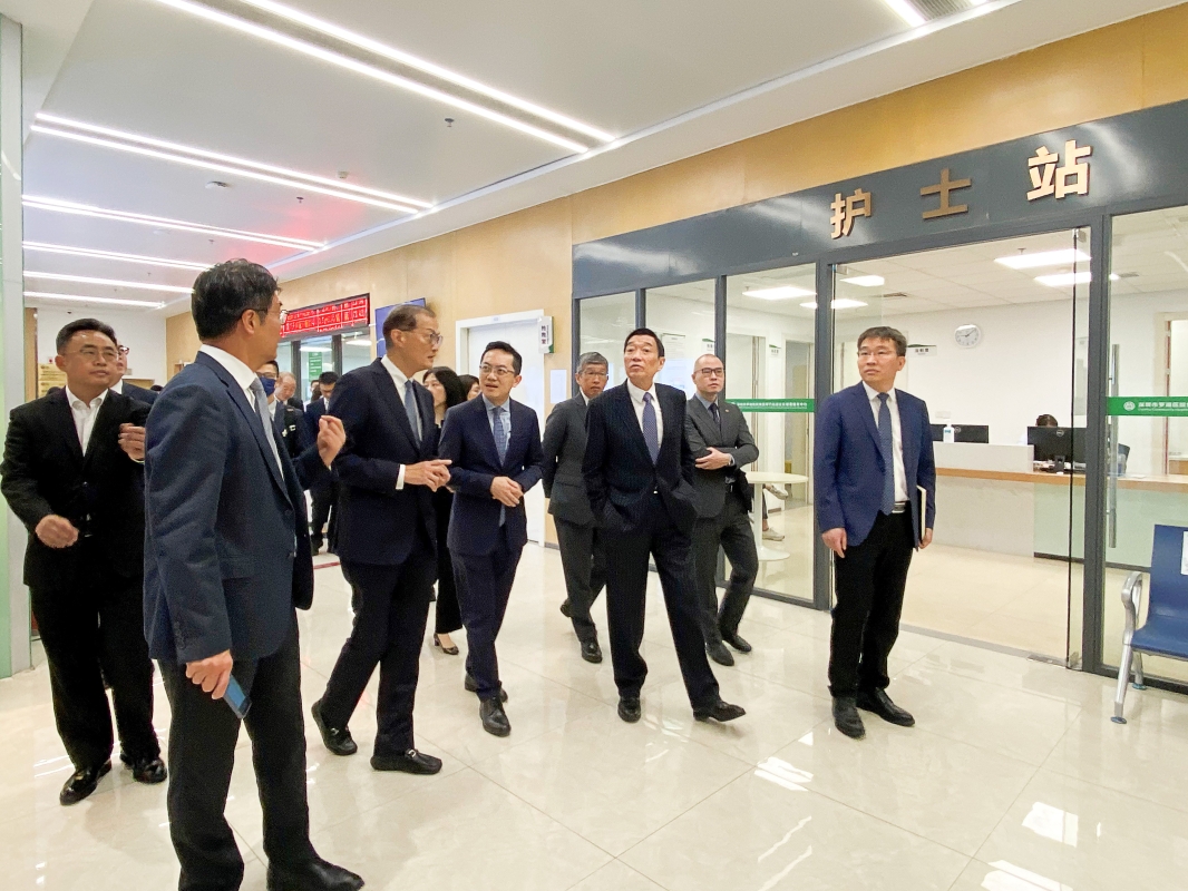 盧寵茂(前排左二)、衞生署署長林文健(前排左三)和醫院管理局主席范鴻齡(前排左四)早上參觀深圳市羅湖醫院集團翠竹街道社區健康服務中心。 由四月十七日開始,合資格的香港長者可以使用特區政府推出的長者醫療券支付華為社康中心門診醫療護理服務的費用。盧寵茂說,這有助居於深圳的香港長者更便利地使用當地門診服務。 訪問團下午到訪香港大學深圳醫院,與院長張文智、深圳市衞生健康委員會副主任李創及多位醫院部門主管舉行會議,了解醫院最新發展,藉此加強深港醫療合作,更好融入粵港澳大灣區發展。(完) 【編輯:崔靜雯】