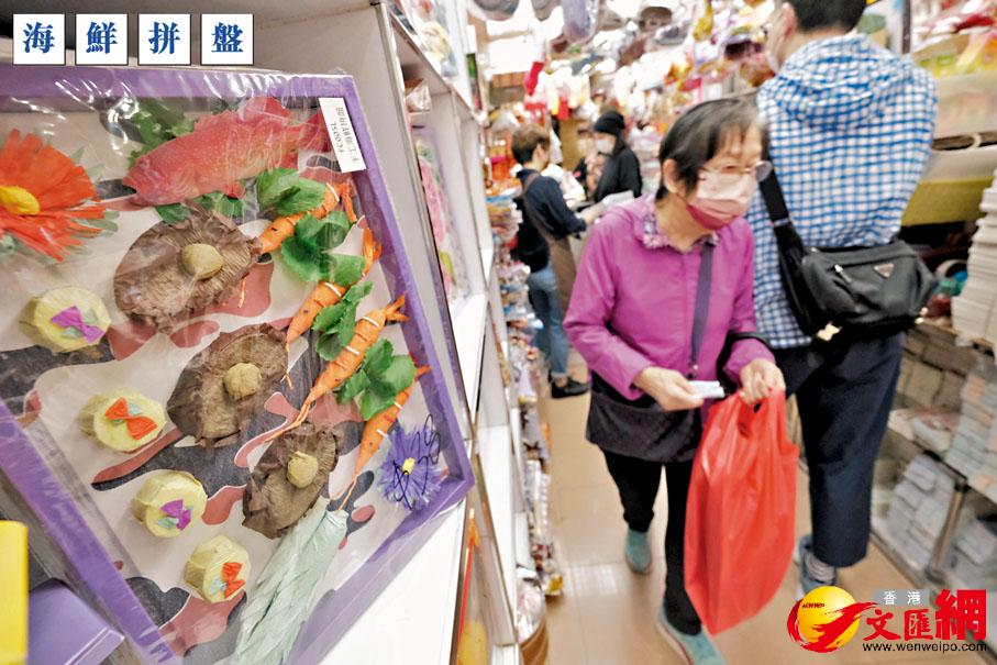 ◆清明祭品銷情“補足兩年份額”,當中“海鮮”等“奢侈品”佔半。(香港文匯報記者 涂穴 攝) 她續指,這兩年紙紮品也推陳出新,不再拘泥於以往的紙錢、大屋,多了個性化的生活用品。“有遊艇、豪車,還有咖啡機、茶具,多了些特別的小東西,連工人都有。”