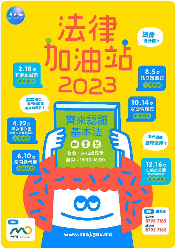 “法律加油站-兒童普法工作坊”可透過一戶通進行報名。 四場以兒童話劇形式舉辦的“法律加油站”活動將分別於4月22日、6月10日、8月5日、10月14日舉行,活動時間為下午3時至4時,現已接受報名,歡迎本澳6至12歲兒童及家長參加,有興趣者可透過一戶通的“活動報名”頁面報名,每場名額8對親子,如報名人數超過數量,將以電腦抽籤方式決定。(完) 【編輯:崔靜雯】