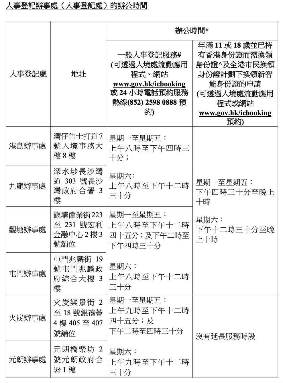 自2023年3月6日起,4間指定人事登記處(即港島辦事處、九龍辦事處、觀塘辦事處及屯門辦事處)延長服務時間至晚上10時。(政府新聞處) 不過,從未登記身份證、年滿11或18歲的市民,仍須預約“一般人事登記服務時段”以辦理首次登記身份證的手續。 此外,入境處亦將人事登記服務預約系統的可預約日子,由現時的24個工作日延長至96個工作日,以便利市民辦理預約手續。 為確保市民可順暢有序地辦理換證手續,市民應根據已預約的時間到達人事登記處辦理申請身份證手續,人事登記處不會處理未有預約的申請。至於因身份證遺失、毀滅、損壞或污損而需要在人事登記處緊急補領身份證的人士,可以毋須預約,人事登記處職員會因應個別情況提供協助。 【編輯:石欢欢】