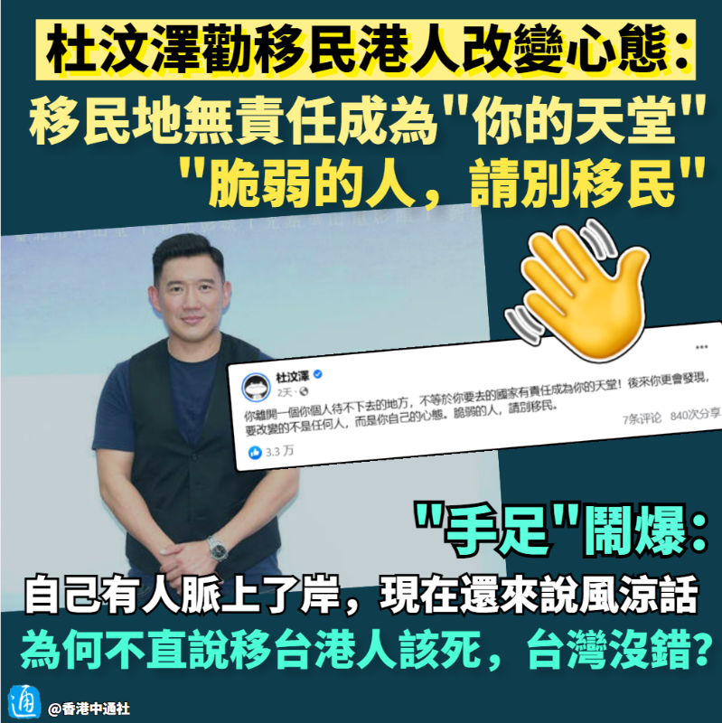 香港新聞網4月14日電 近期,不少盲目跟風移民的港人抱怨無法適應當地生活,希望回流香港。而早已離港居台的“黃絲”藝人杜汶澤則化身“人生導師”,勸說“手足”改變心態。 對於頻頻有港人抱怨移民生活不如預期,杜汶澤近日在社交媒體大講風涼話,稱港人離開一個自己待不下去的地方,不等於要去的地方“有責任成為你的天堂!” 他又勸誡“手足”移民後若感不適,要改變的不是當地政府,而是移民者自己的心態。喊話道,“脆弱的人,請別移民”。 杜汶澤帖文被網友轉載至“黃絲”大本營連登討論區後,大批“手足”留言鬧爆! “自己有人脈上了岸,現在還來說風涼話,多少人移民後被騙了,等了很久都拿不到合法身份?”有網友指責杜汶澤在移台港人有困難時不發聲,反倒替台當局“洗白”,“杜汶澤先生為何不直接說移台港人該死,台灣沒錯?” 也有網友揶揄,在台灣坐擁豪宅的杜汶澤怎會在意“手足”生活,“移台之後他唯一關心的就是香港‘手足’有沒有課金(付費)給他。” 更有網友嘲諷杜汶澤乃典型的“墻頭草”——“在香港的時候就是香港人,去台灣就變台灣人,找水魚(冤大頭)的時候又變回香港人,講心態變化沒人比得過杜汶澤!” 有網友就苦口勸誡港人不要再聽信“黃絲”KOL的言論盲目移民了。“有部分移民的人信了這些所謂KOL的話,以為外面有多好,移民之後才發現上當了。”