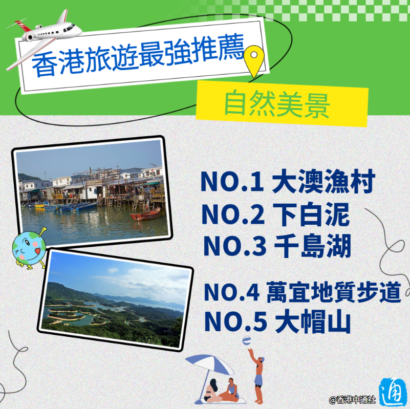 香港中通社製圖 港人推介的“自然美景”五強,大澳漁村排名首位,其餘依次是元朗的下白泥、大欖的千島湖、萬宜地質步道以及大帽山,其他推介還有東坪洲、流水響水塘、西貢橋咀洲等。