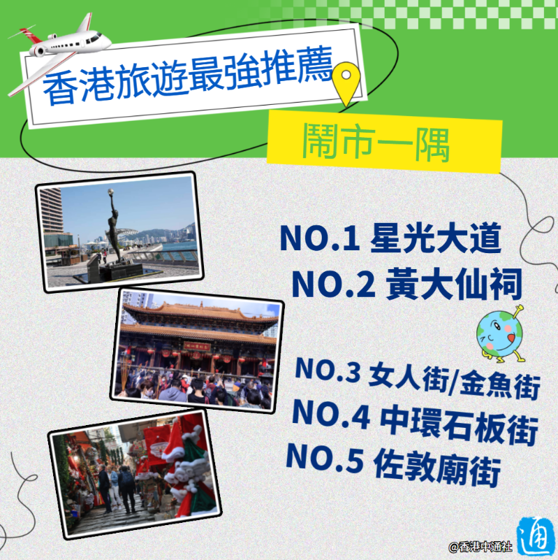 香港中通社製圖 至於鬧市景點,最多香港市民揀選展出多位本地演藝人掌印的尖沙咀星光大道,排第二的是展現傳統文化的黃大仙祠。之後的三位也是特色街道,包括旺角女人街、金魚街、中環石板街及佐敦廟街。
