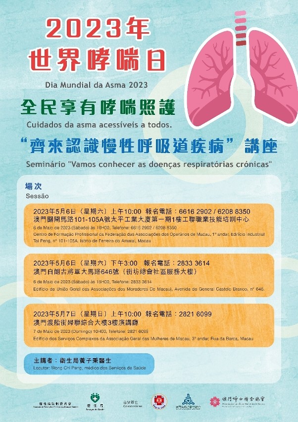 圖片來源:澳門新聞局 與民間社團辦社區講座科普相關知識 衛生局為響應“世界哮喘日”的倡議,聯同慢性病防制委員會成員澳門街坊會聯合總會、澳門工會聯合總會和澳門婦女聯合總會,5月6及7日合辦“齊來認識慢性呼吸道疾病”的社區講座,共3場次,向居民科普哮喘及慢性阻塞性肺病兩種最常見慢性呼吸道疾病的成因及預防方法,加強居民對慢性呼吸道疾病的認識,儘早做好保健預防措施。 避免接觸誘發因素減少發作用藥亦可以控制 衛生局指出,哮喘是影響兒童及成人的主要慢性疾病,患者常見症狀是咳嗽、胸悶及呼吸困難,並常在夜間或運動期間加重,而哮喘通常很難找到單一的直接病因。