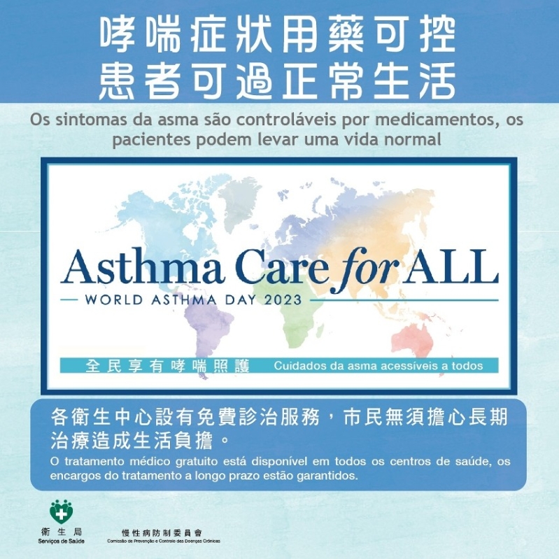 圖片來源:澳門新聞局 世界衛生組織資料顯示,全球於2019年約有2.62億人有哮喘問題,46.1萬人死亡,而大多數哮喘死亡發生在低收入和中低收入國家,這些國家診斷及治療能力不足使患者無法有效控制症狀,可能會無法上學和工作。 在澳門,2021年已登記的哮喘患者共有2515名,佔當年年終總人口0.4%,當中以60至74年齡組佔比最高,為25.6%。 提供全面醫療保健無須支付高昂治療費用 衛生局表示,哮喘急性發作時會出現咳嗽、胸悶、氣喘甚至呼吸困難,嚴重可導致死亡,哮喘已被列入《慢性非傳染性疾病預防和控制的全球行動計劃》和《聯合國2030年可持續發展議程》,而其中的《慢性非傳染性疾病預防和控制的全球行動計劃》提及,“全民健康覆蓋的重要性,特別要通過初級衛生保健和社會保障機制實視全民覆蓋,以便向所有人尤其最貧窮階層,提供獲取衛生服務的機會”、“必須確保這些服務的使用不會讓使用者陷入經濟困境”。 世界衛生組織資料顯示,2019年在低收入國家初級公共衛生保健設施中,僅一半哮喘患者使用支氣管擴張劑,不到五分之一患者使用類固醇吸入劑。 澳門衛生局一直致力為澳門居民提供全面初級醫療保健服務,針對慢性疾病儘量做到早發現、早治療,及治療藥物不會對居民造成經濟負擔,甚至大部分治療藥物也在醫療保障範圍,令患者無須額外支付高昂的藥物治療費用;同時,積極增強公眾對哮喘病防治和自我管理的認知,減少對哮喘用藥的誤解。