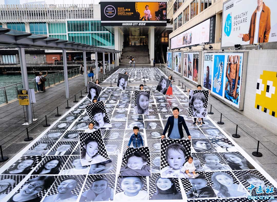 香港海港城近日舉辦黑白風藝術裝置第二彈——國際性共創藝術企劃《Inside Out Project》,發起“Inside Out:Harbour and the City”大型展覽,邀請香港市民拍下笑臉照片,一起傳播歡樂。4月24日,海港城海運大廈露天廣場,不少市民拿起自己的照片海報共同合影。(香港中通社記者 曹文毓攝)