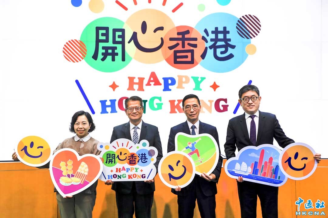 4月24日,香港特區政府舉行記者會,介紹“開心香港”活動。圖為香港特區政府財政司司長陳茂波(左二)、香港特區政府文化體育及旅遊局局長楊潤雄(右二)、香港特區政府民政及青年事務局局長麥美娟(左一)和香港旅遊發展局總幹事程鼎一(右一)出席記者會。(香港中通社記者 許其皓攝)