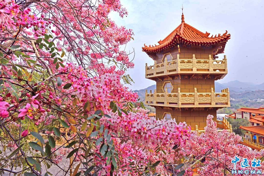 台灣中南部粉嫩花旗木正盛開,花旗木搭配中國風塔樓,與火車鐵道同框美景,如夢似幻,粉紅花朵如煙火炸開十分浪漫,呈現出獨特的秘境氛圍。 香港中通社圖片