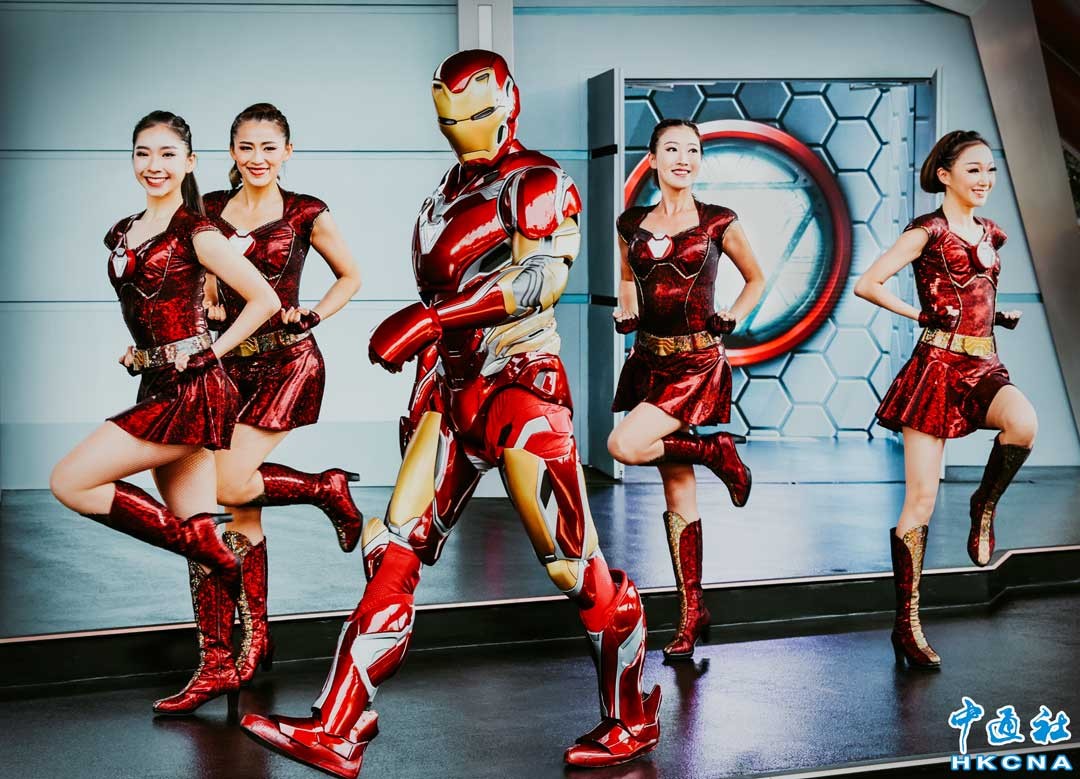 4月28日,香港迪士尼推出“漫威超級英雄匯”活動,讓遊客近距離與“超級英雄”接觸。圖為漫威“超級英雄”角色“鋼鐵俠”。(香港中通社記者 謝光磊攝)