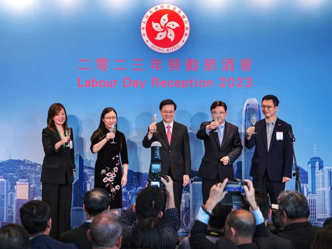 4月28日,香港特區行政長官李家超為勞工處舉行的勞動節酒會主禮。獲邀出席的嘉賓包括行政會議成員、立法會議員、工會領袖、僱主組織的代表,以及與勞工事務有關的委員會和組織代表。圖為祝酒儀式。(香港中通社記者 謝光磊攝)