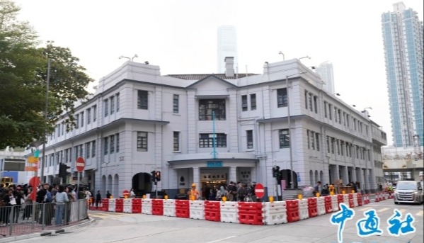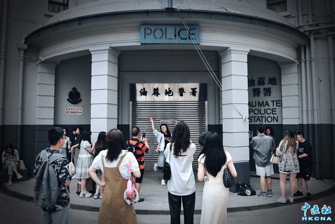 4月30日正值五一旅遊黃金周,大批旅客訪港遊玩,除了太平山頂、尖沙咀星光大道、中環蘭桂坊這些耳熟能詳的景點外,舊油麻地警署也成為一個遊客打卡的熱點。座落在油麻地廣東道鬧市的舊油麻地警署,是電影或電視劇中時常出現的背景,它是一座新古典主義愛德華式建築物,現被列為二級歷史建築。圖為當日,大批旅客在舊油麻地警署前拍照。(香港中通社記者 謝光磊攝)