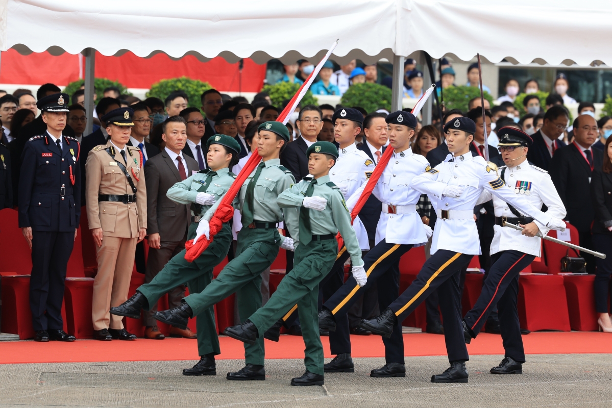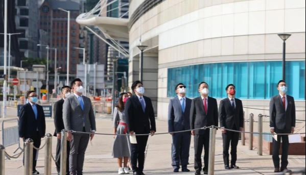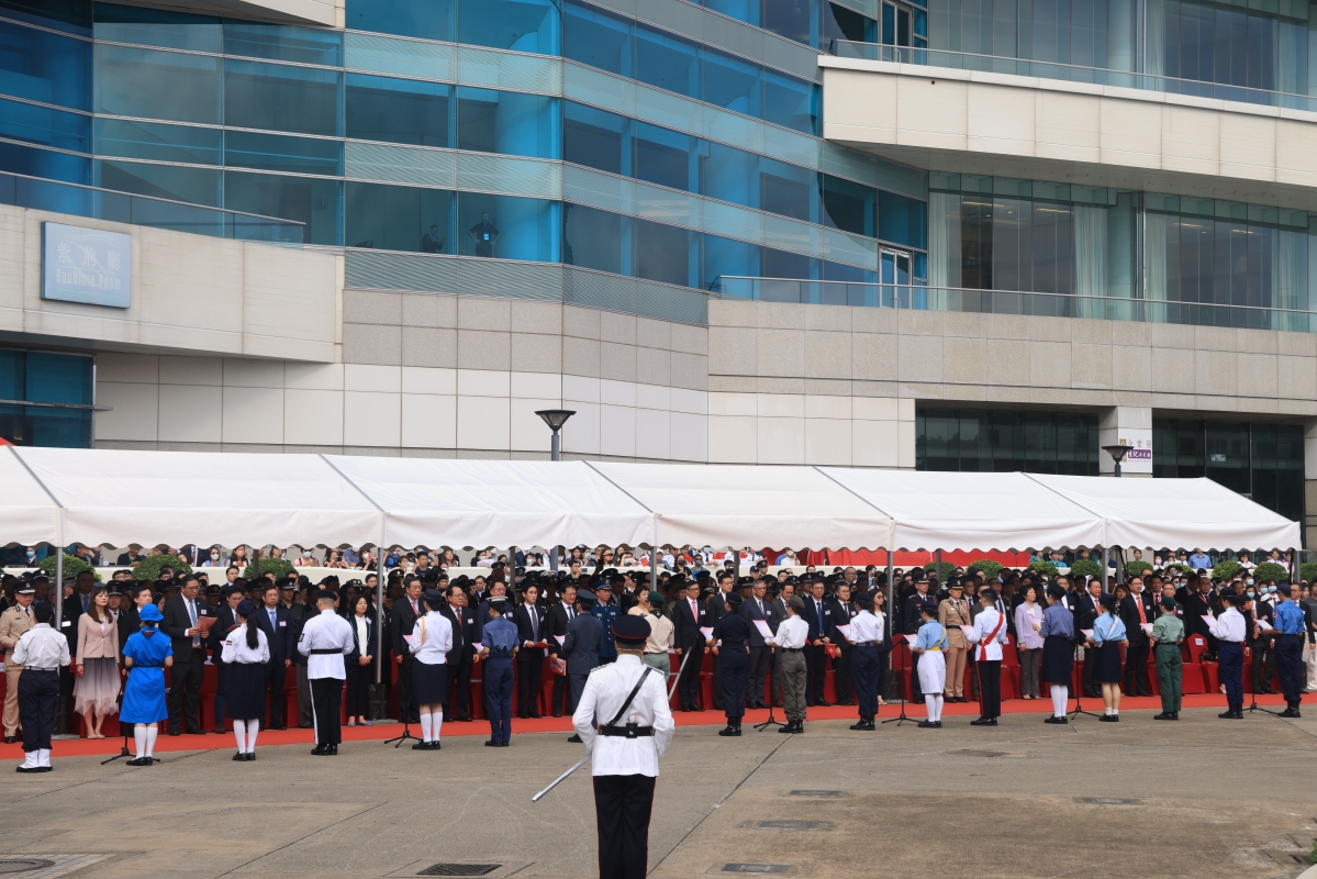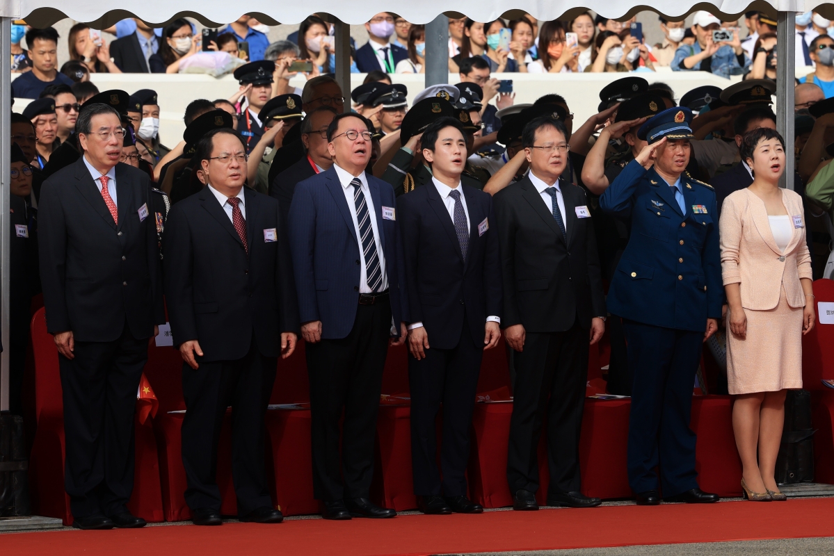 香港特區政府政務司司長陳國基(左三)、香港中聯辦副主任陳冬(右三)、外交部駐港特派員公署副特派員潘雲東(左二)等嘉賓出席升旗禮