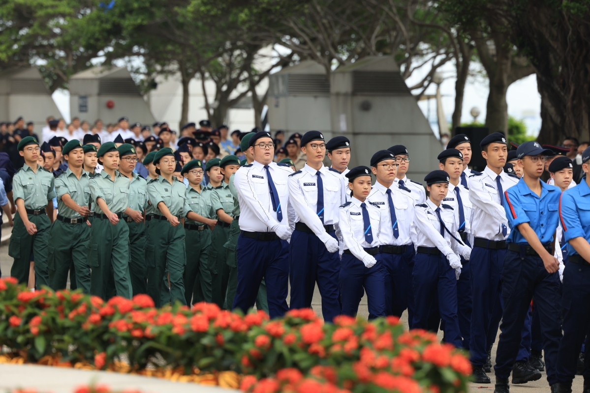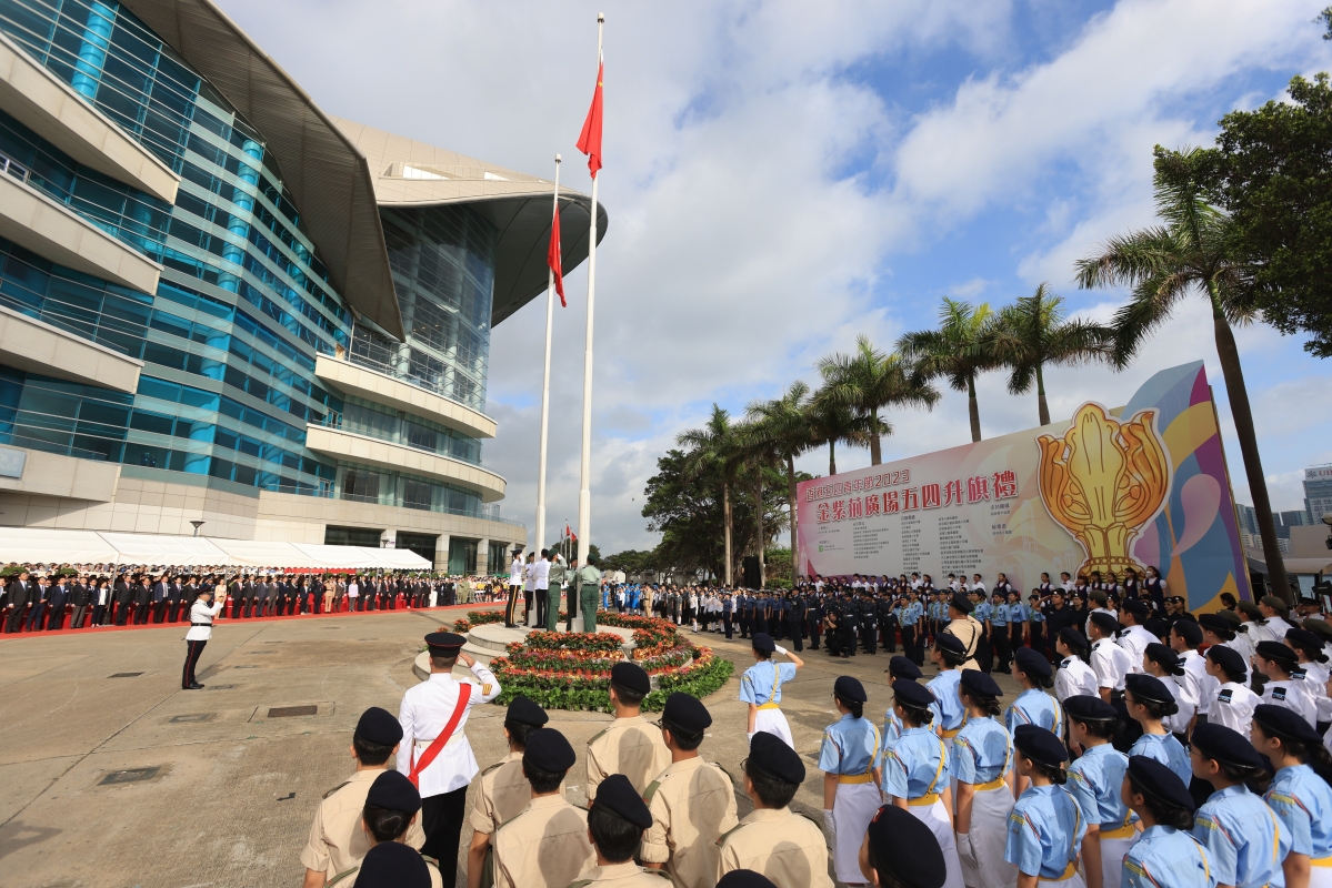 香港新聞網5月4日電(記者 許其皓)5月4日是青年節,香港各界青少年活動委員會在金紫荊廣場舉行升旗禮,紀念五四運動、弘揚五四精神。香港特區政府政務司司長陳國基、香港中聯辦副主任陳冬、外交部駐港特派員公署副特派員潘雲東等嘉賓出席升旗禮。 這是疫情後香港首次复辦“金紫荊廣場五四昇旗禮”活動邀請了19隊青少年制服團隊隊伍以及多達1500名學生到場觀賞升旗禮,參與人數為歷年來最高。