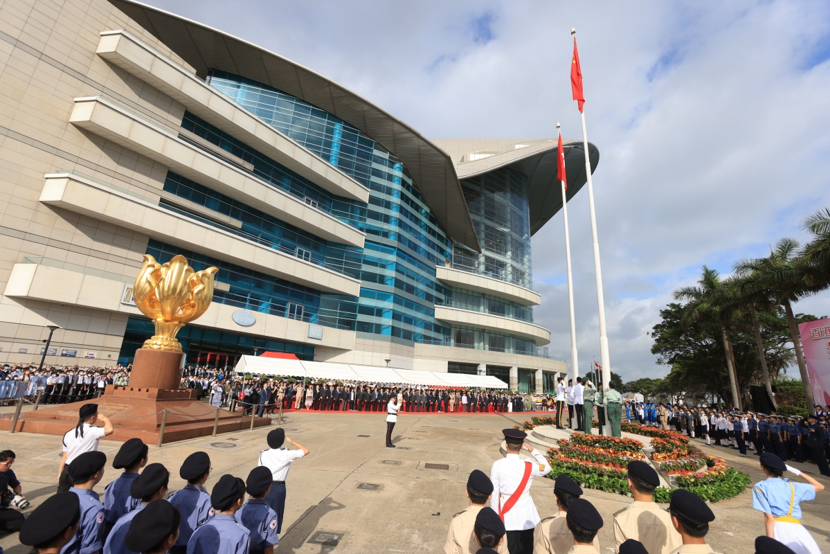 上午8時,在莊嚴的國歌聲中,鮮艷的中華人民共和國國旗和香港特區區旗冉冉升起