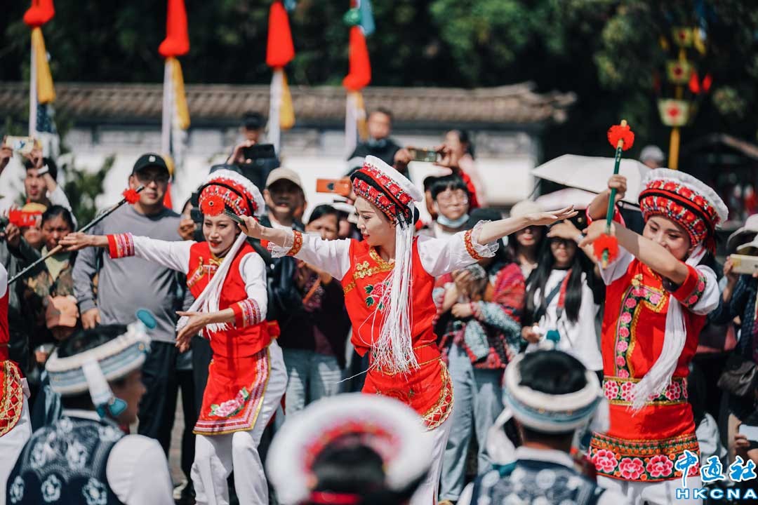 5月1日,雲南昆明,白族女孩表演霸王鞭舞。 “五一”假期期間,位於昆明市的雲南民族村舉辦白族“繞三靈”民俗活動,吸引來自國內外的遊客在樂曲和舞蹈中體驗白族風情。據了解,“繞三靈”,是白族民眾的傳統盛會,歷史悠久,2006年5月,白族繞三靈被列入國家級非物質文化遺產保護名錄。香港中通社圖片
