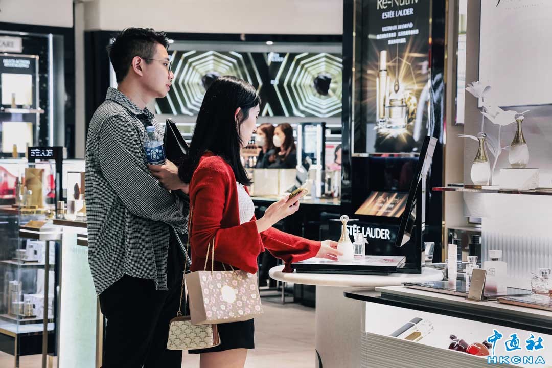 5月2日,遊客在香港尖沙咀商圈購物,不少名店前大排長龍。當時香港特區行政長官李家超出席行政會議前見記者時表示,香港今年第一季經濟錄得2.7%正增長,相信第二季經濟會比第一季好,今年勝去年。(香港中通社記者 曹文毓攝)