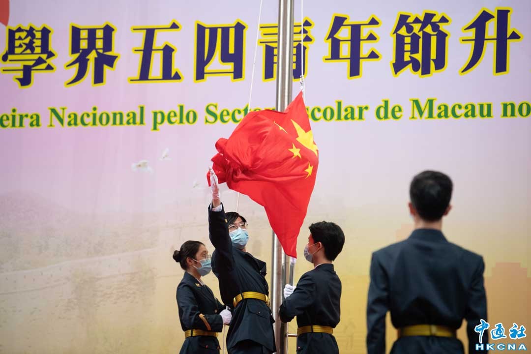 5月4日,澳門學界升旗隊在儀式上。當日,2023澳門學界五四青年節升旗儀式在理工大學體育館舉行。澳門學界升旗隊隊員列陣整齊步操至升旗台,當中華人民共和國國歌奏響,升旗手有力揚起國旗,五星紅旗徐徐升起。香港中通社圖片