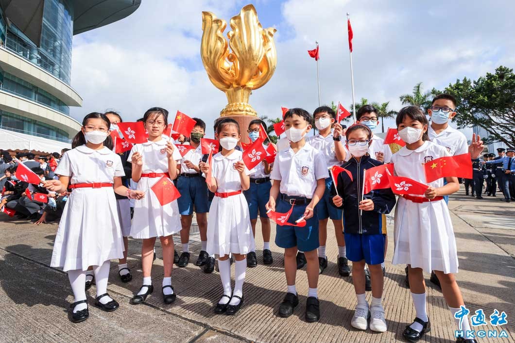 5月4日是青年節,香港各界青少年活動委員會在金紫荊廣場舉行升旗禮,紀念五四運動、弘揚五四精神。活動邀請了19隊青少年制服團隊隊伍以及多達1500名學生到場觀賞升旗禮,參與人數為歷年來最高。圖為升旗禮後學生們在金紫荊廣場興奮地揮動著中華人民共和國國旗和香港特區區旗。 (香港中通社記者 許其皓攝)