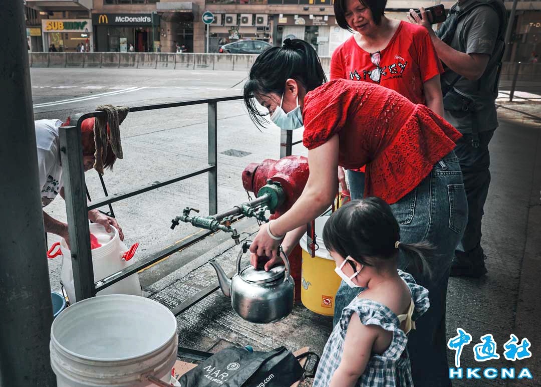 5月5日,香港土瓜灣馬頭圍道一間地舖新店裝修,疑因水喉老化導致爆水管,水務署職員閂水掣後,附近6幢唐樓及地舖逾300戶無食水供應。水務署隨後在上鄉道的消防栓安裝臨時街喉及擺放食水缸。圖為不少居民排隊在消防喉旁取水,商戶及街坊對此均叫苦連天。 (香港中通社記者 謝光磊攝)
