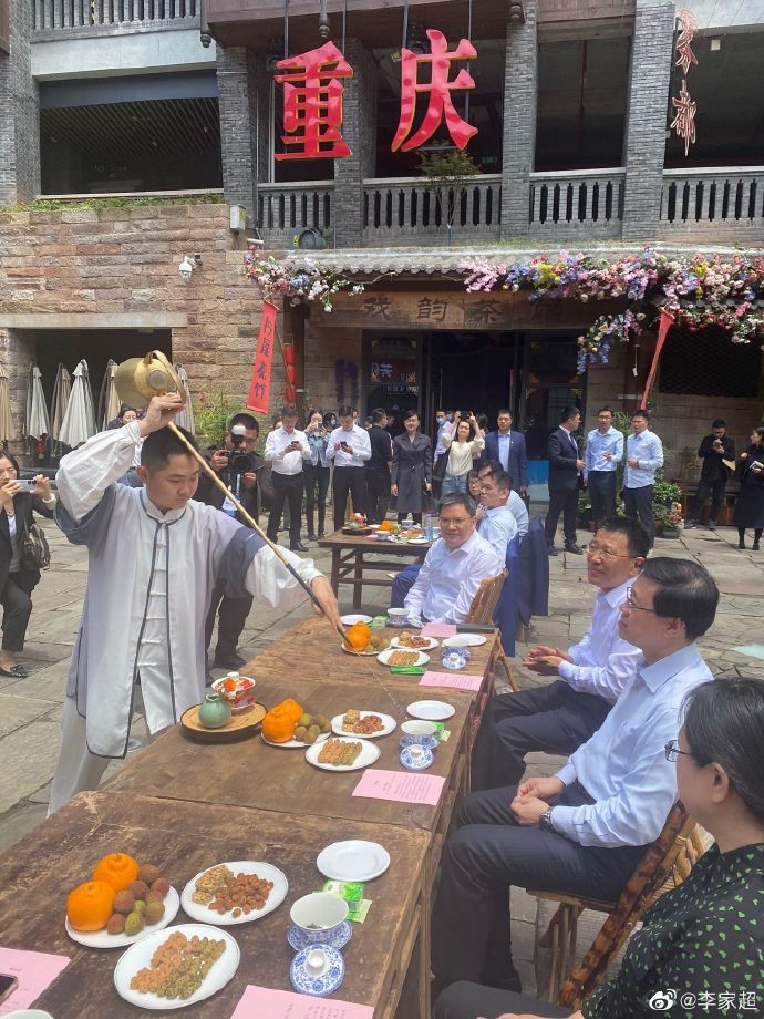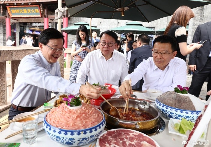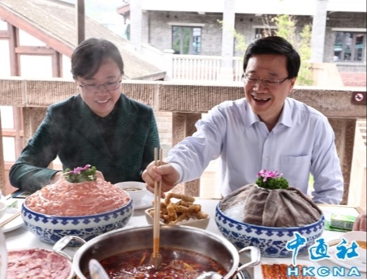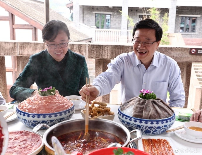 香港新聞網5月11日電 行政長官李家超10日起率領特區代表團到重慶市進行為期3日的交流訪問。李家超今晚(11日)在社交媒體發文稱,十分感謝重慶市委書記袁家軍和我一同參觀磁器口,磁器口古鎮入選全國“非遺旅遊景區”,讓我體驗重慶深邃的文化內涵。 李家超表示,中午還與重慶市副市長張國智到磁器口歷史街區的一家火鍋店,品嚐重慶麻辣火鍋,大家都吃得津津有味。“對於能挑戰正宗的麻辣火鍋,我和團隊中幾位好辣之人都感到興奮!大家還有什麼重慶美食推介?”