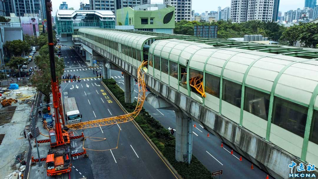 5月10日,台灣台中市南屯區文心南路一處建築工地,接近台中捷運豐樂公園站,發生一起鋼樑倒塌意外,疑似吊車施工不當,吊起的鋼架鐵條掉落,砸向正在行駛中的捷運列車,車廂被砸出兩個大洞,造成1死8傷,目前台中捷運已宣布停駛。 香港中通社圖片