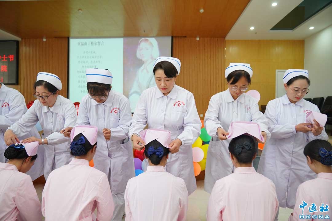 5月12日,護士長為16名新入職護士授帽。當日是第112個“5·12”國際護士節,昆明市的盤龍區人民醫院舉行慶祝活動,向夜以繼日奮戰在臨床一線的“白衣天使”們送上節日的祝福。香港中通社圖片
