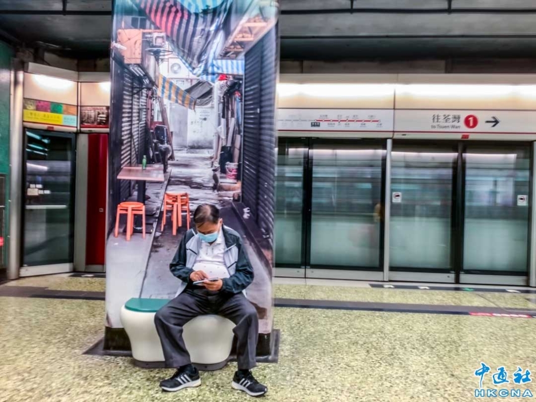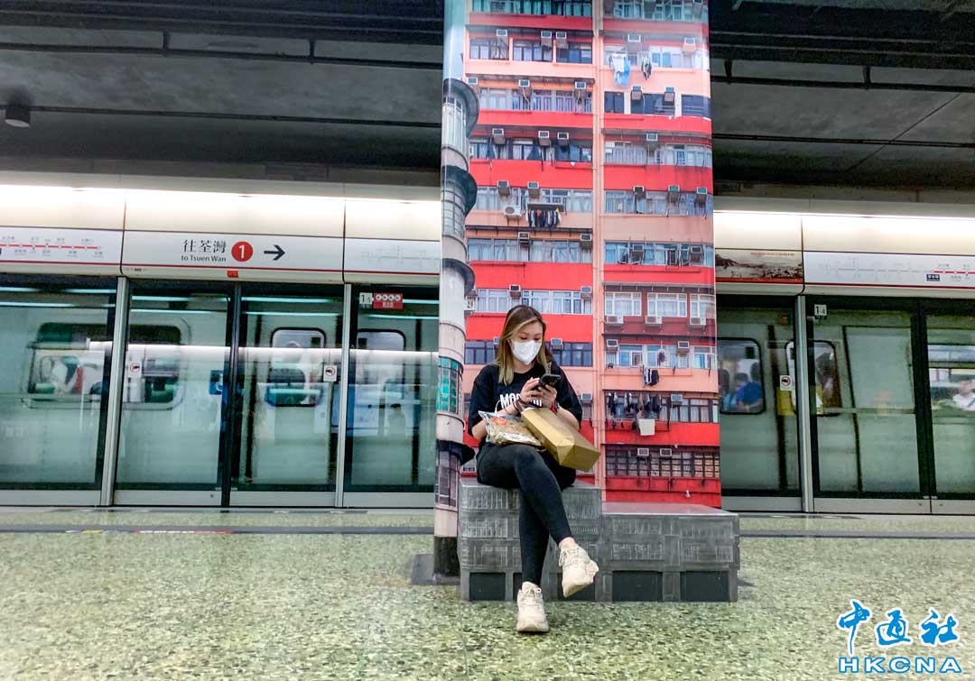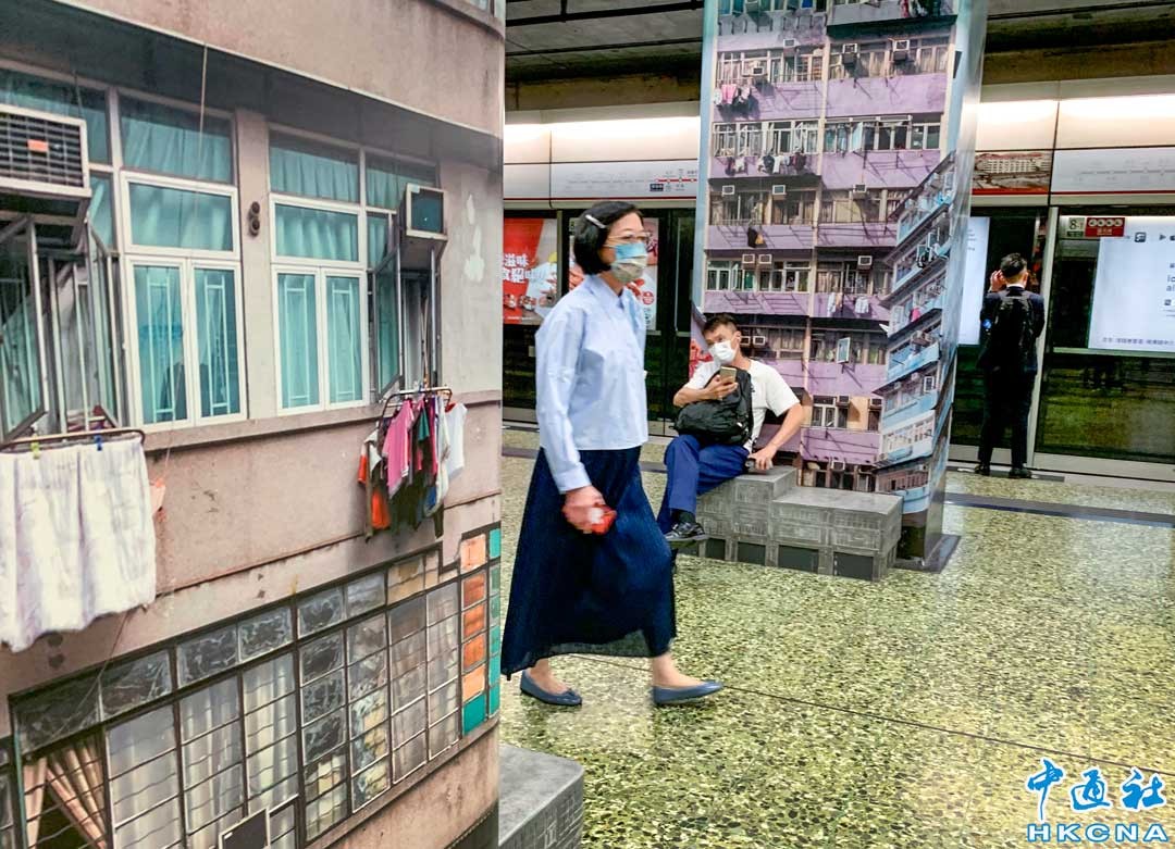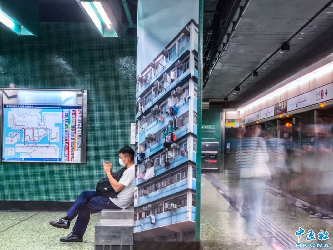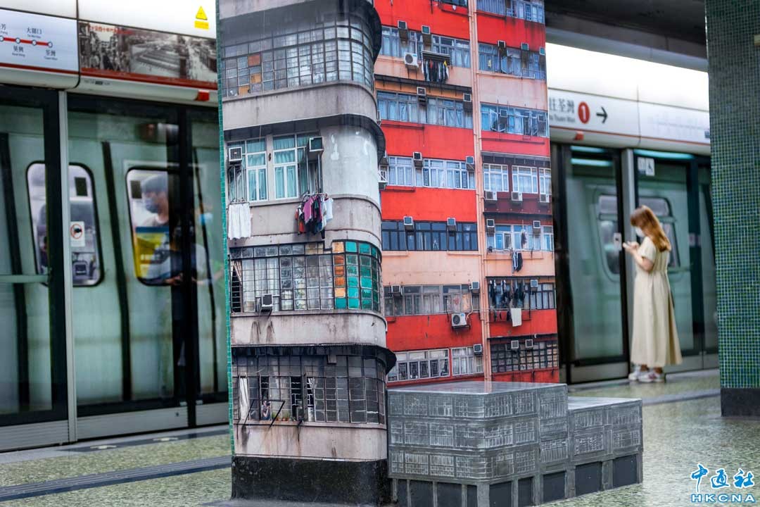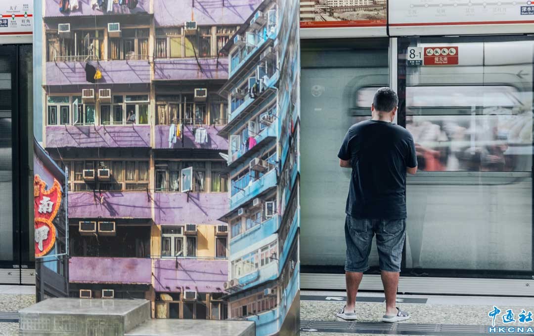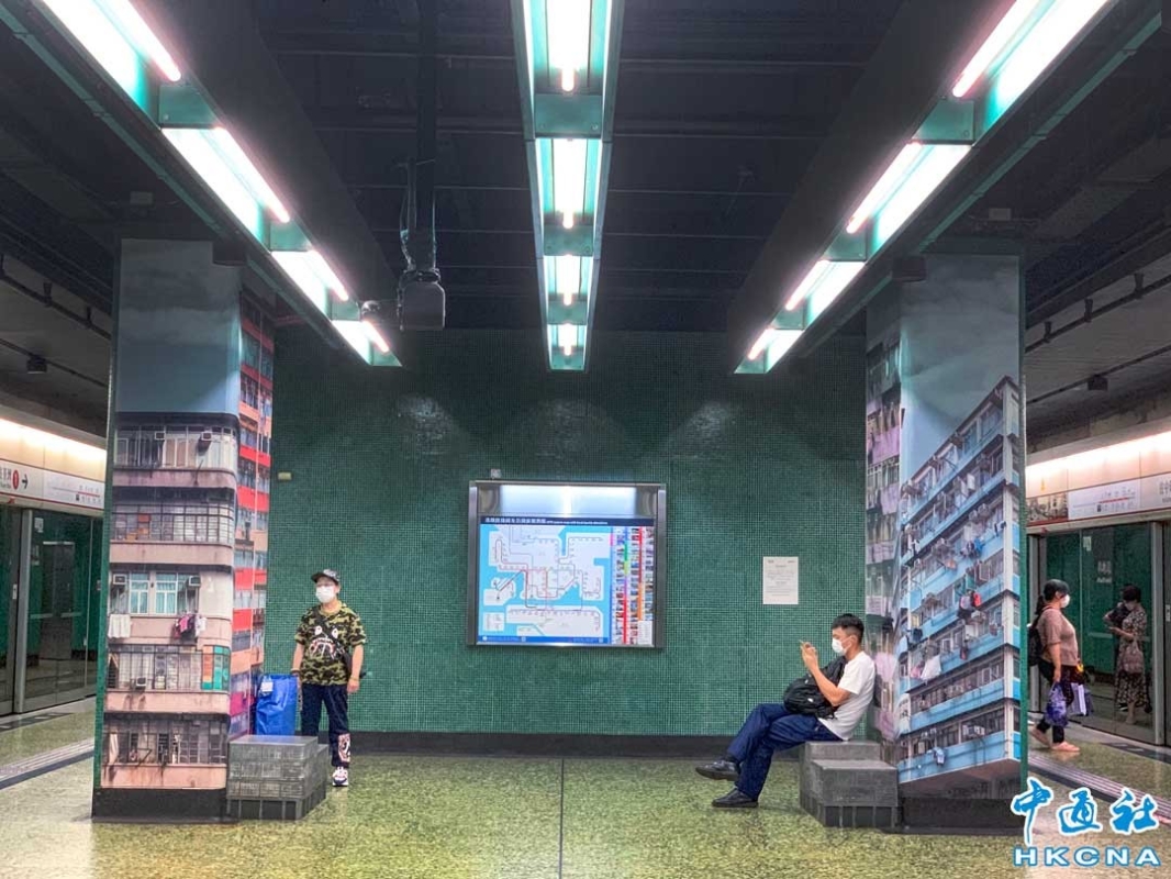 香港新聞網5月19日電 香港深水埗地鐵站月台的頭尾兩端牆壁,貼有充滿社區特色的建築壁畫,濃濃的道地風情展示了深水埗獨特的文化和氛圍,地鐵的快與舊時光的慢形成了一個有趣的對比,成為遊客打卡影相的景點之一。 (香港中通社記者 徐文峰攝)