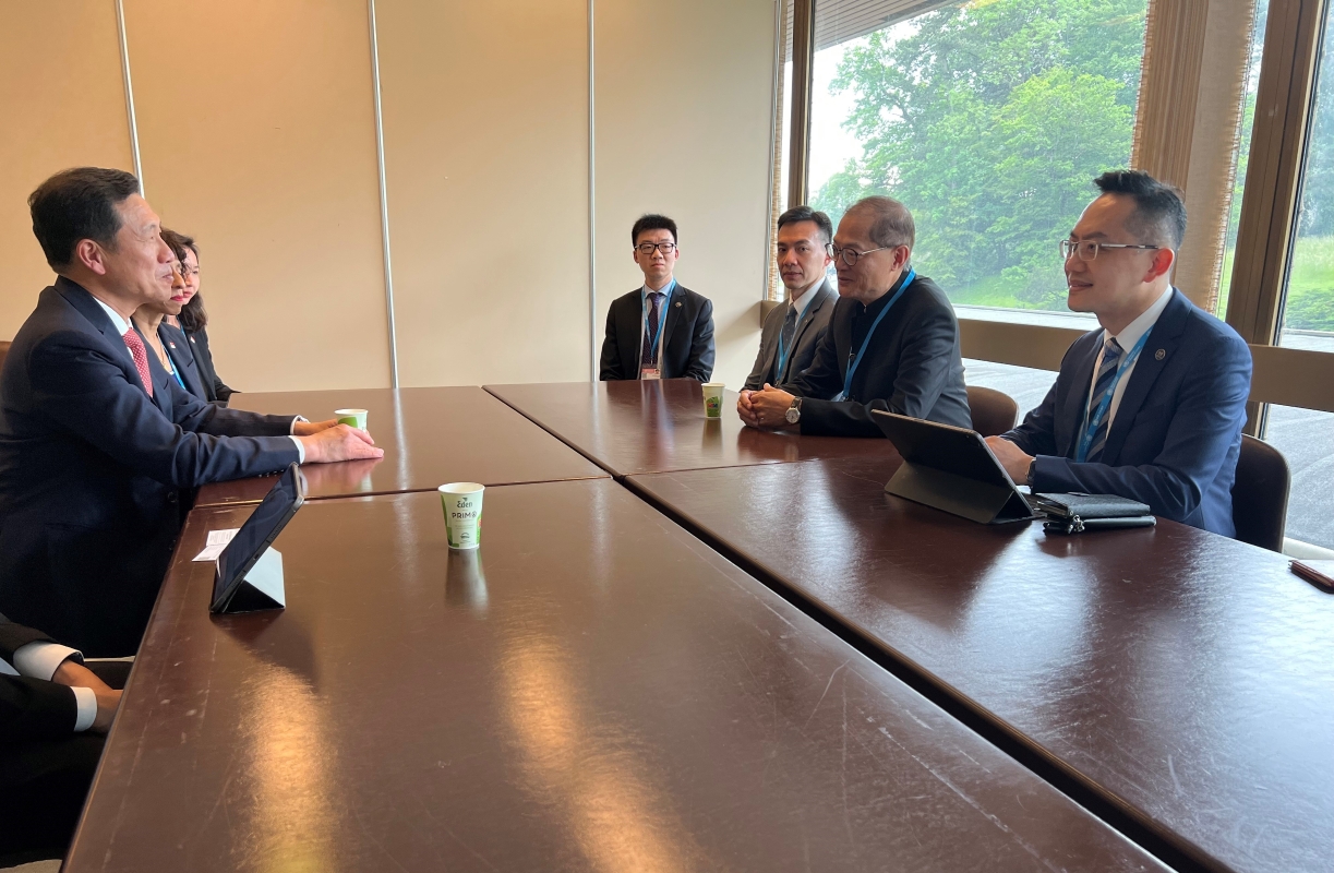 圖片來源:香港政府新聞處。盧寵茂教授(右二)在瑞士日內瓦出席世界衞生組織第七十六屆世界衞生大會。其間,他與新加坡衞生部長王乙康(左一)會面,分享兩地抗擊新冠疫情的經驗和香港在基層醫療和醫護人手等醫療衞生範疇的最新發展。林文健(右一)亦有出席。