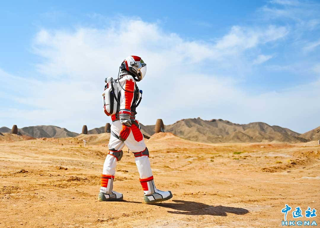 5月15日,體驗者在火星1號基地內進行出艙漫步訓練。“火星1號基地”位於甘肅省金昌市,由中國航天員科研訓練中心和中國航天科技國際交流中心指導建設。此地的戈壁灘擁有與火星最為相似的地形地貌特征。基地通過火星生存場景模擬、實體建築仿制、科幻造景等手段,打造出中國首個火星主題沉浸式實景體驗基地。 香港中通社圖片